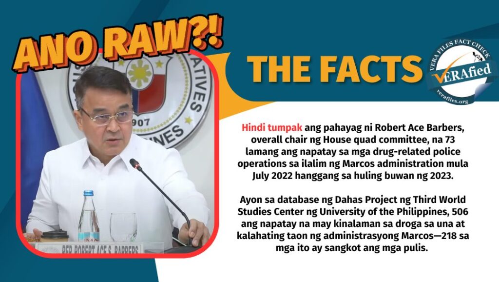 Hindi tumpak ang pahayag ni House Rep. Robert Ace Barbers na 73 lamang ang napatay sa mga drug-related police operations sa una at kalahating taon ng Marcos administration.
