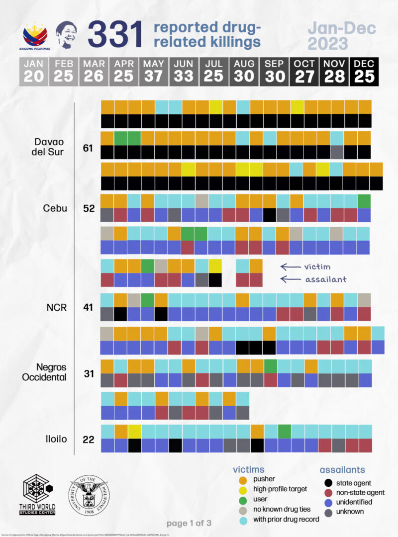 In 2023, Davao Del Sur was the country’s top hot spot in reported drug-related killings, where 60 of the 61 killings were done in the context of police operations. The only victim who was not killed by state agents was also the single case that transpired outside Davao City in 2023. Since July last year, we have already highlighted how the killings in “Davao City belie Marcos’ ‘New Face’ approach in fight vs illegal drugs.”