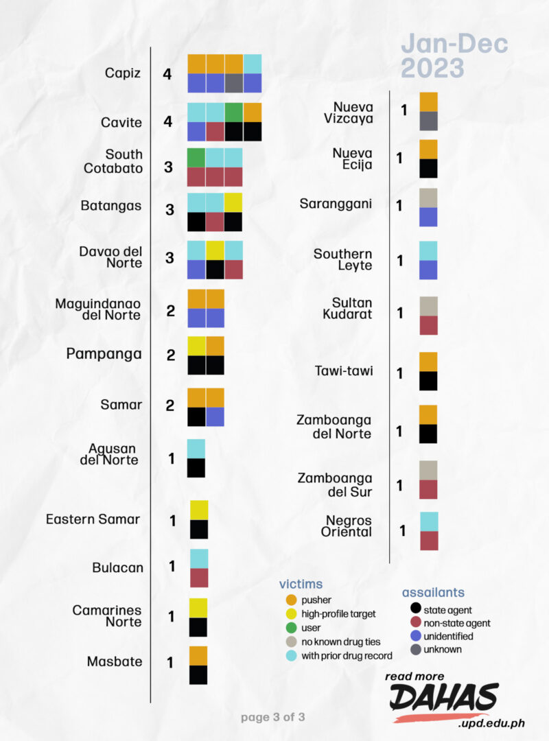 In Dahas’s monitoring, state agents who were killed in drug-related operations or because of their work in narcotics are counted under the category “no known drug ties.” For 2023, of the 331 casualties, 21 are listed in this category: 7 state agents, 3 police informants, 1 barangay official, 1 former witness in a drug case, and 9 “collateral damage.” Because of their proximity to the main target of the killing or those who were killed because of mistaken identity, they were considered “collateral damage.”